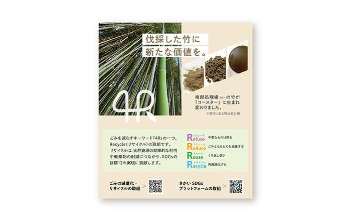 発生した伐採竹を、ただリサイクルで活用するだけでなく、新たに作り出されたものが市民のSDGsや4Rに対する啓蒙に繋がれば、とのご希望も頂きました。