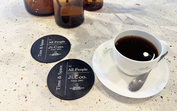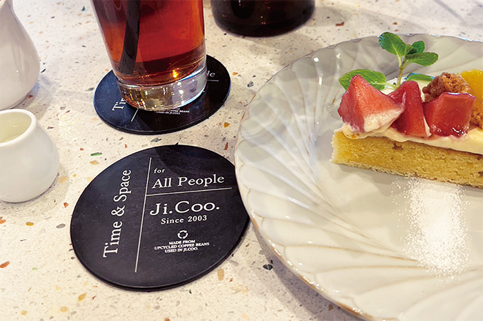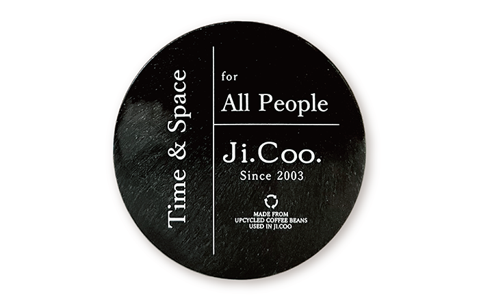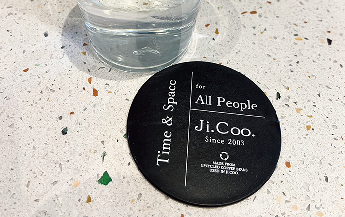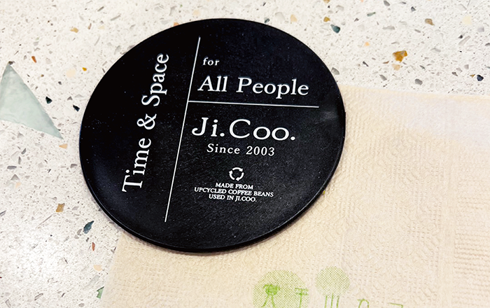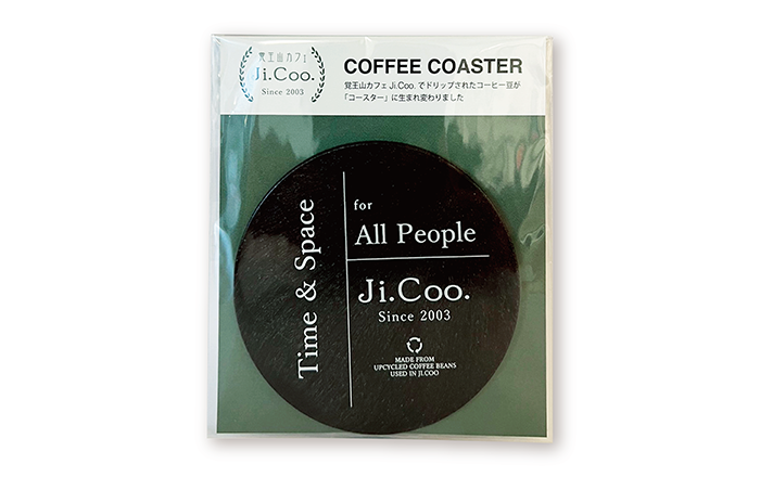 表面にはJi.Coo.さんが大切にしている、すべてのお客様に心地よい時間と空間を、というフレーズと共に、お店で発生したコーヒー豆かすを使用してコースターが作られていることがさりげなくお洒落に記載されています。