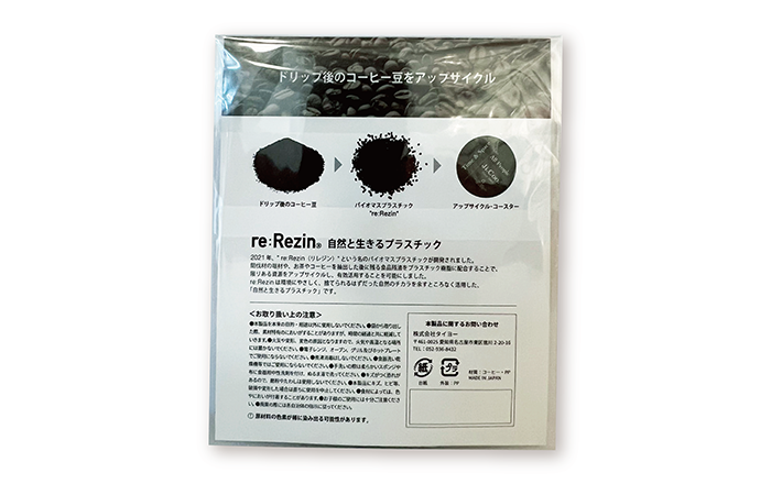 店舗で提供されるコーヒーをドリップしたした時に出る、コーヒー豆かすを定期的に集めて弊社に送って頂き、乾燥・粉砕をしてコースターの原材料となるプラスチック樹脂に作り変えました。